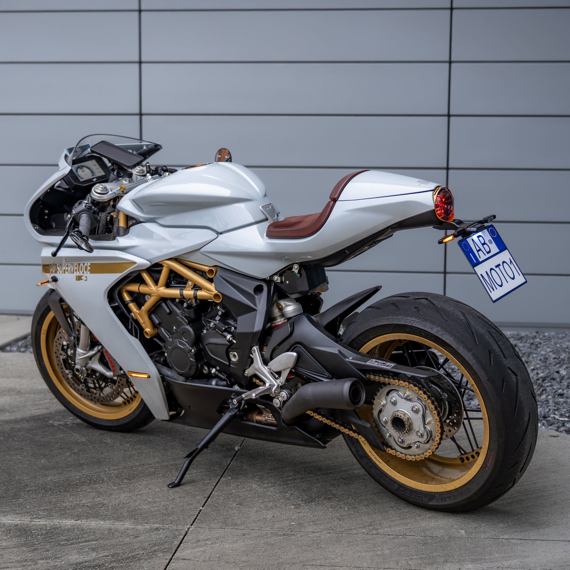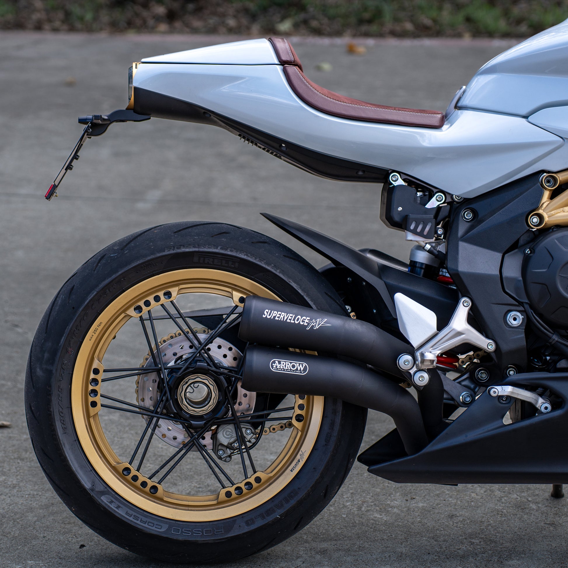 Made from all billet aluminum, with the exception of the license bracket, this tail tidy is designed to blend with the lines of the Superveloce while keeping legal indicator spacing requirements. The kit also offers the choice of two different size license brackets.